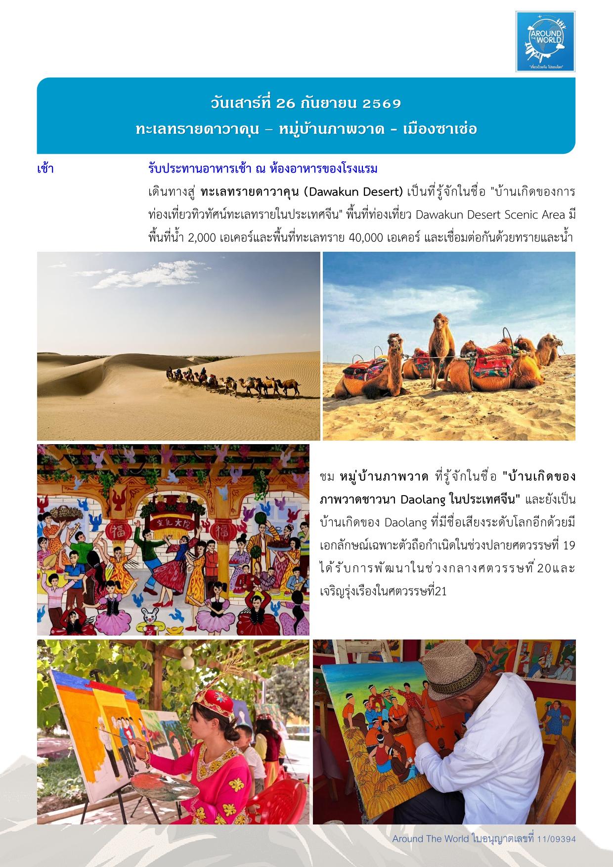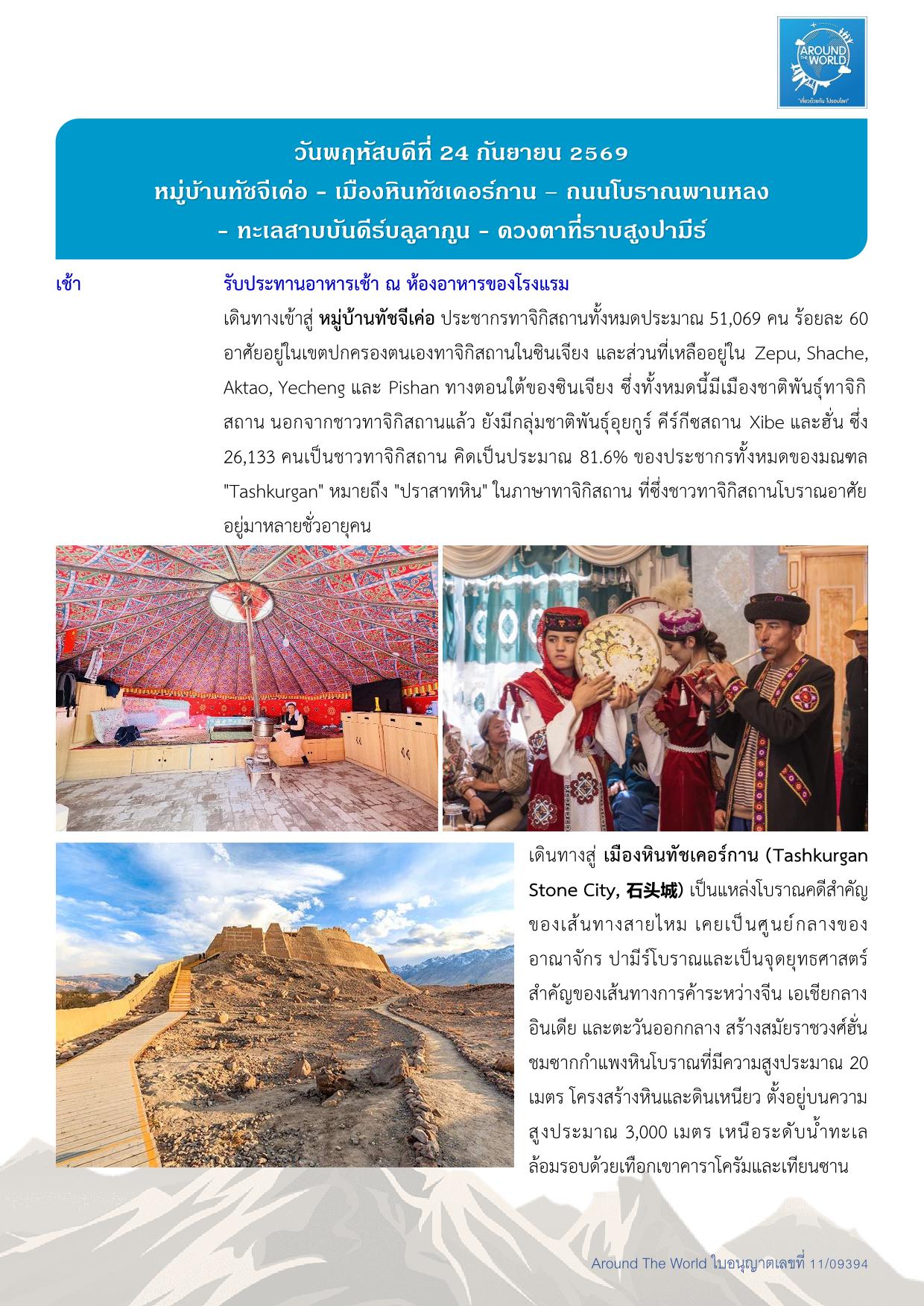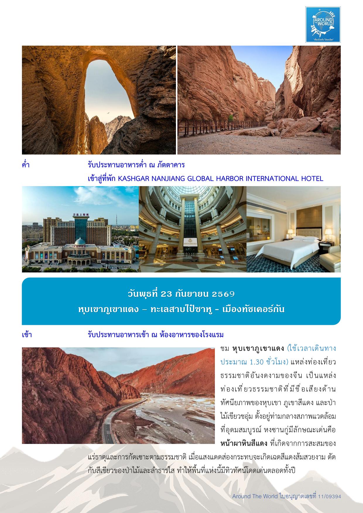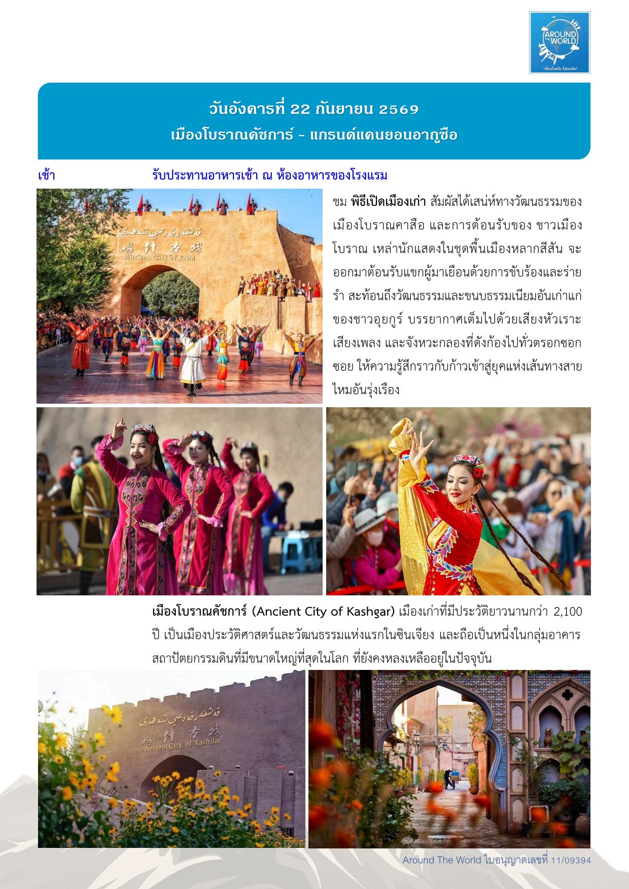 สนามบินสุวรรณภูมิ – สนามบินเฉิงตู ประเทศจีน - สนามบินคัชการ์ – เมืองคัชการ์ - เมืองโบราณคัชการ์ - แกรนด์แคนยอนอาถูซือ - เมืองโบราณคัชการ์ - แกรนด์แคนยอนอาถูซือ - ถนนโบราณพานหลง – ทะเลสาบบันดีร์บลูลากูน - หมู่บ้านทัชจีเค่อ - ทะเลสาบไป๋ซาหู – ทะเลสาบคาราคูเล่อ - ทะเลทรายดาวาคุน – หมู่บ้านภาพวาด - เมืองไมไกติ - พระราชวังยาร์คันด์ ข่าน – สวนป่าหูหยาง - สุสานพระนางเซียงเฟย – สนามบินคัชการ์ - สนามบินเฉิงตู -