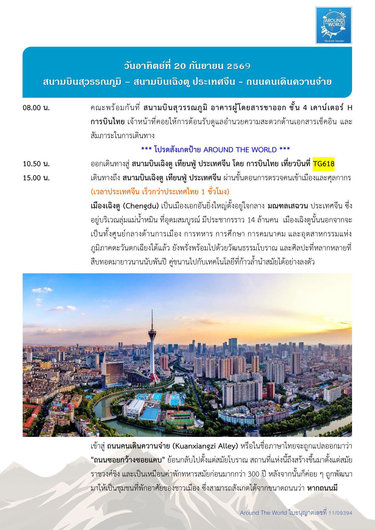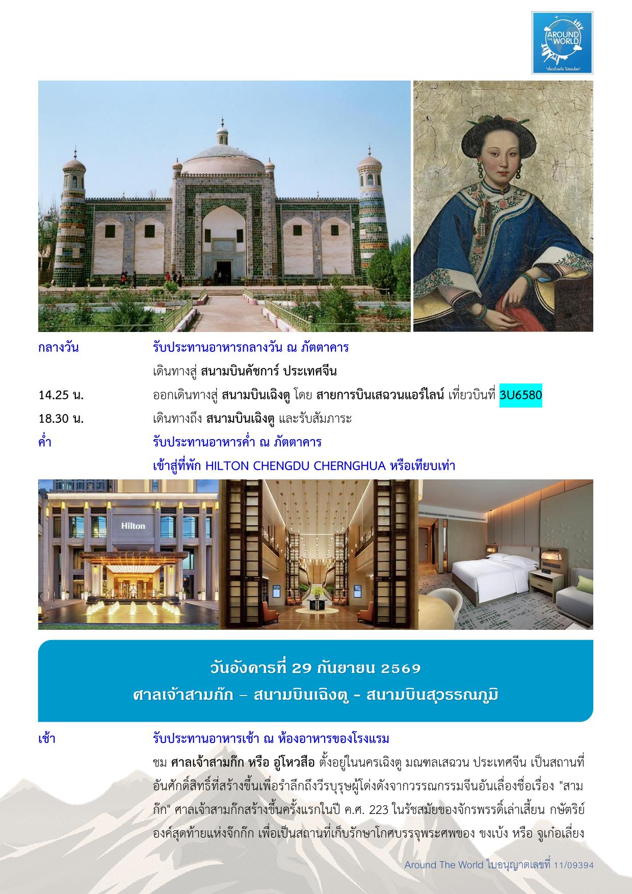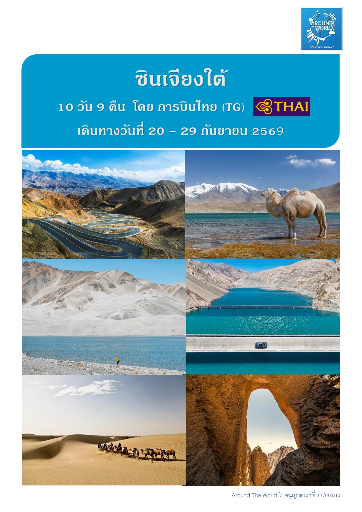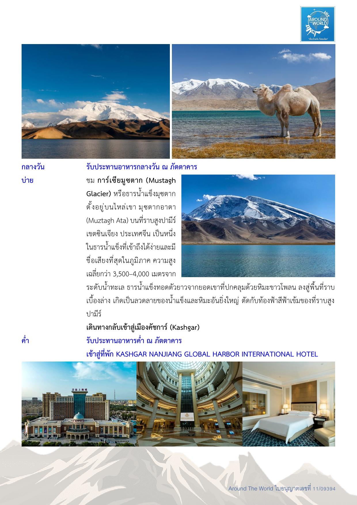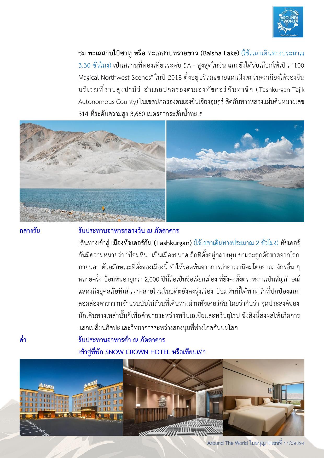 สนามบินสุวรรณภูมิ – สนามบินเฉิงตู ประเทศจีน - สนามบินคัชการ์ – เมืองคัชการ์ - เมืองโบราณคัชการ์ - แกรนด์แคนยอนอาถูซือ - เมืองโบราณคัชการ์ - แกรนด์แคนยอนอาถูซือ - ถนนโบราณพานหลง – ทะเลสาบบันดีร์บลูลากูน - หมู่บ้านทัชจีเค่อ - ทะเลสาบไป๋ซาหู – ทะเลสาบคาราคูเล่อ - ทะเลทรายดาวาคุน – หมู่บ้านภาพวาด - เมืองไมไกติ - พระราชวังยาร์คันด์ ข่าน – สวนป่าหูหยาง - สุสานพระนางเซียงเฟย – สนามบินคัชการ์ - สนามบินเฉิงตู -